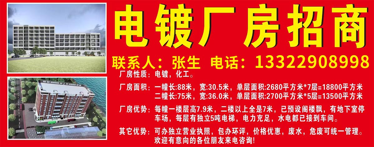 现增资扩产共投入资全约:80000多万元新扩建电镀房约30000平米,每层约2500平方,层高7米。租排污指标充足,包办环评,可做各类电银及氧化使用,免租期半年,预计24年年底前有厂房交付。现接受预定,提前预定成功的可享受交房市场租全价格优惠5-10元每平方。先定先得。联系电话:13322908998 张生。