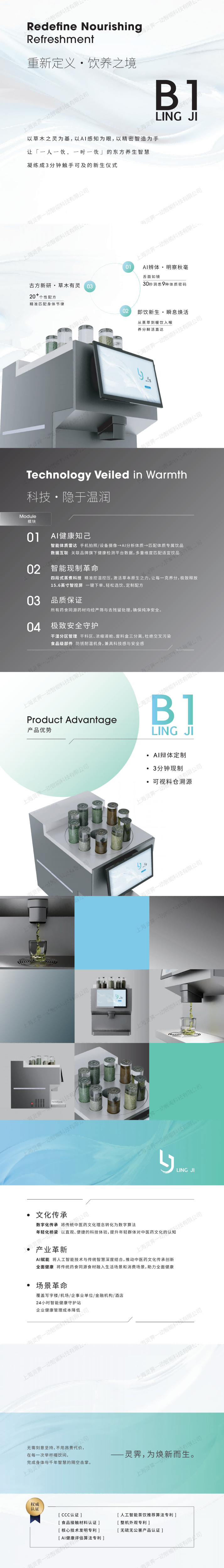 上海灵霁一动智能科技有限公司是一家深耕软件研发与前沿信息技术解决方案的国家高新技术企业。我们致力于为政府、医疗机构、企业及个人提供覆盖 AI+大健康、智能物联网、生命科技等领域的深度定制化数智服务,推动健康产业智能化升级。我们以用户为中心,打造一系列软硬件结合的创新产品,让健康管理更智能、更便捷。 灵霁 B1 智能健康饮品机是澎湃跃动负责产品研发,灵霁一动复杂销售运营的战略级创新产品,拥有多项专利技术,可全自动现制健康饮品,为用户精准定制及推荐适宜饮品。智能评估、精准推荐,以千人千面、一人一饮打造个性化的健康生活体验。